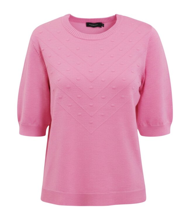 Deze roze gebreide damestrui van Brandtex combineert comfort met een verfijnde uitstraling. De korte mouwen en de subtiele nopjesstructuur geven de trui een speels, maar toch elegant karakter. Het V-vormige breipatroon aan de voorzijde zorgt daarbij voor een extra vrouwelijk accent.