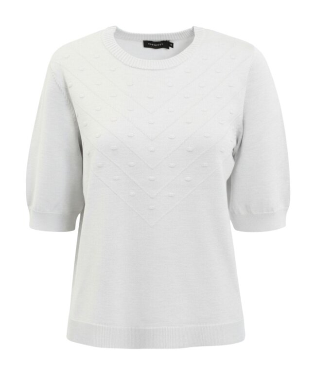 Deze wolwitte gebreide dames trui van Brandtex is een stijlvolle en comfortabele keuze voor elk seizoen. De trui heeft korte mouwen en een verfijnde structuur met subtiele nopjes en een V-vormig breipatroon aan de voorzijde, wat zorgt voor een elegante en vrouwelijke uitstraling.