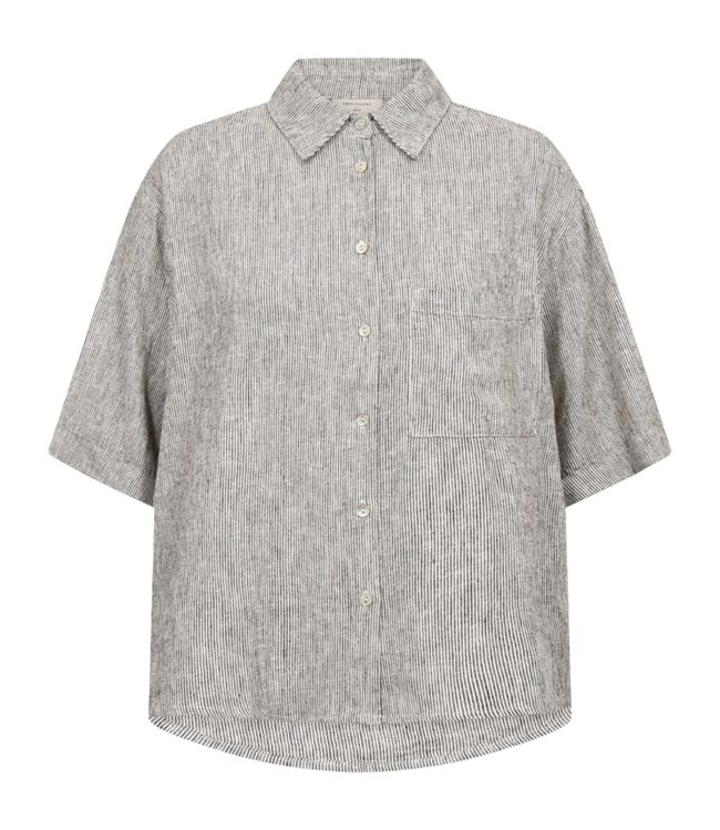 Het model is voorzien van een klassieke kraag, korte mouwen en een knoopsluiting aan de voorzijde. De borstzak en rechte pasvorm geven de blouse een casual en moderne uitstraling.