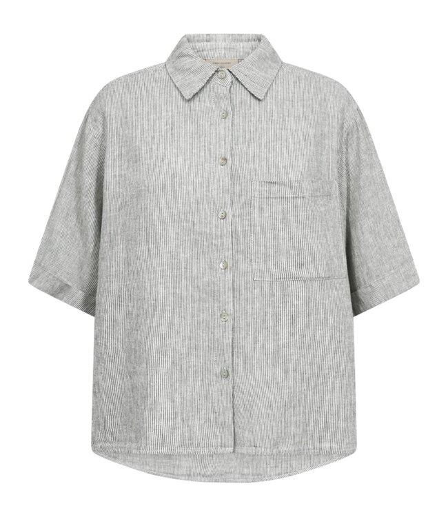 Deze groene dames blouse van FreeQuent heeft een subtiel streeppatroon dat zorgt voor een rustige en natuurlijke uitstraling. De zachte tinten geven de blouse een tijdloze en veelzijdige look.