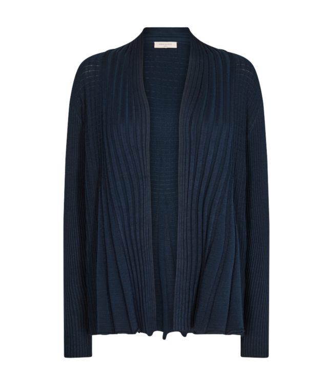 Het open dames vest Claudisse in marine is een stijlvol en veelzijdig item voor je garderobe. Dit vest heeft een elegante plisséstructuur die zorgt voor een vloeiende en moderne uitstraling. Het openvallende model maakt het gemakkelijk te combineren met zowel casual als chique outfits.