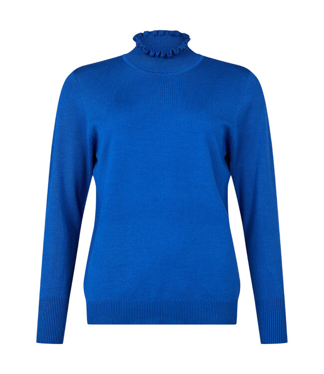 De trui is uitgevoerd met een turtleneck (opstaand boordje) dat subtiel is afgewerkt met fijne ruches, wat zorgt voor een vrouwelijke touch. Het effen design maakt deze pullover makkelijk te combineren met elke outfit, of je nu kiest voor een jeans, rok of pantalon.