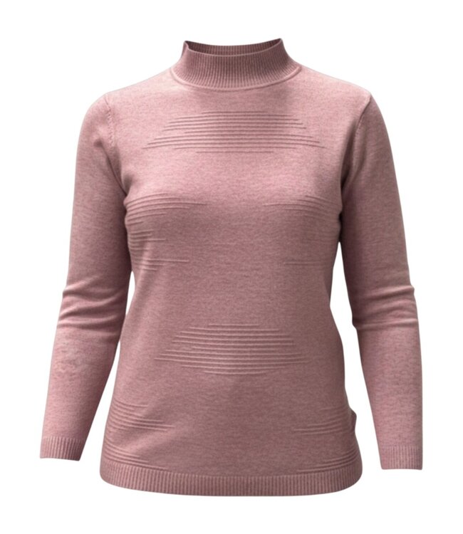 Deze warme dames trui in zacht oudroze is een ideaal kledingstuk voor wie graag comfort en vrouwelijkheid combineert. De opstaande kraag geeft de trui een moderne en luxe uitstraling, terwijl de subtiele ingebreide strepen zorgen voor een speels maar rustig effect. De trui valt soepel langs het lichaam zonder strak te zitten, waardoor hij geschikt is voor zowel een normale als vollere pasvorm.
